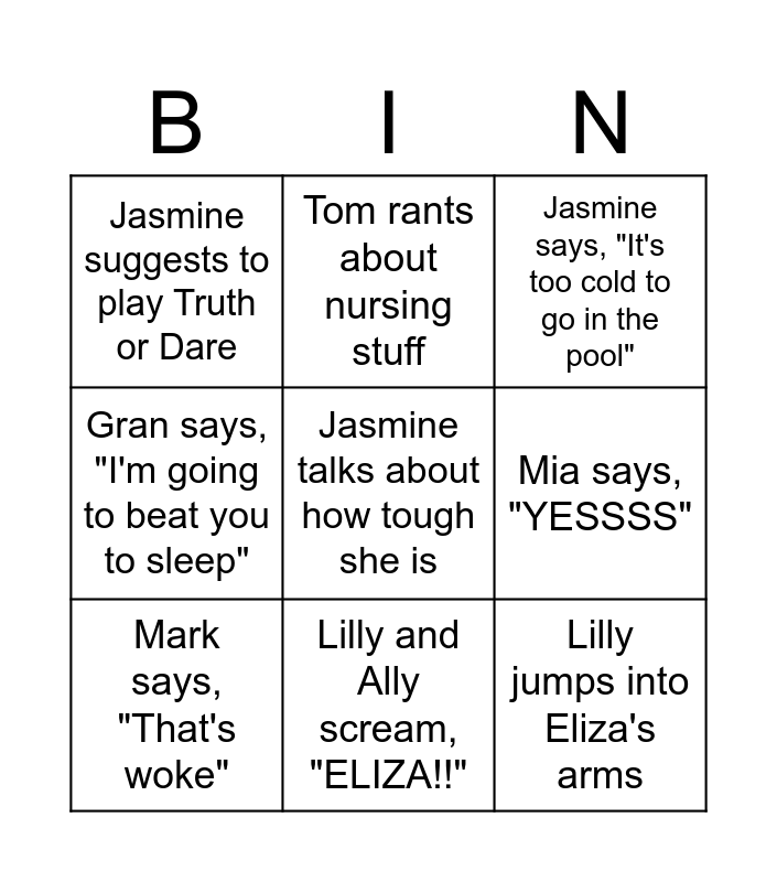 This bingo card has 9 words: Mark says, "That's woke", Jasmine says, "It's too cold to go in the pool", Tom rants about nursing stuff, Gran says, "I'm going to beat you to sleep", Jasmine suggests to play Truth or Dare, Mia says, "YESSSS", Jasmine talks about how tough she is, Lilly jumps into Eliza's arms and Lilly and Ally scream, "ELIZA!!".
