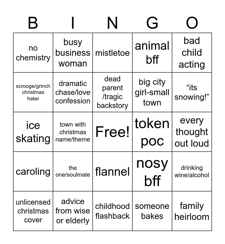 This bingo card has a free space and 24 words: the one/soulmate, advice from wise or elderly, dead parent /tragic backstory, unlicensed christmas cover, bad child acting, no chemistry, scrooge/grinch christmas hater, busy business woman, token poc, flannel, big city girl-small town, ice skating, nosy bff, drinking wine/alcohol, dramatic chase/love confession, someone bakes, every thought out loud, mistletoe, “its snowing!”, town with christmas name/theme, family heirloom, caroling, animal bff and childhood flashback.