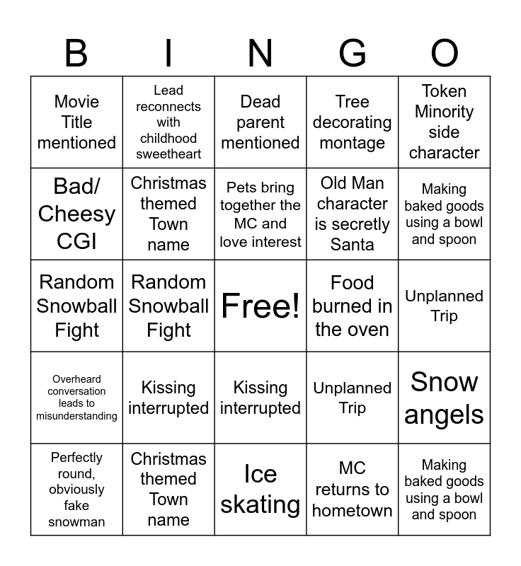 This bingo card has a free space and 48 words: Christmas Themed name, Making baked goods using a bowl and spoon, Perfectly round, obviously fake snowman, Ice skating, Kissing interrupted, Overheard conversation leads to misunderstanding, Lead reconnects with childhood sweetheart, Big bad Corpo moves in, Bad/ Cheesy CGI, A workaholic learns to relax, Christmas themed Town name, Tree decorating montage, Snow angels, Unplanned Trip, Gets Stranded/ Snowed-in, MCs Singing Carols, Pets bring together the MC and love interest, Food burned in the oven, Dead parent mentioned, Token Minority side character, Random Snowball Fight, MC returns to hometown, Movie Title mentioned, Old Man character is secretly Santa, Christmas Themed name, Making baked goods using a bowl and spoon, Perfectly round, obviously fake snowman, Ice skating, Kissing interrupted, Overheard conversation leads to misunderstanding, Lead reconnects with childhood sweetheart, Big bad Corpo moves in, Bad/ Cheesy CGI, A workaholic learns to relax, Christmas themed Town name, Tree decorating montage, Snow angels, Unplanned Trip, Gets Stranded/ Snowed-in, MCs Singing Carols, Pets bring together the MC and love interest, Food burned in the oven, Dead parent mentioned, Token Minority side character, Random Snowball Fight, MC returns to hometown, Movie Title mentioned and Old Man character is secretly Santa.