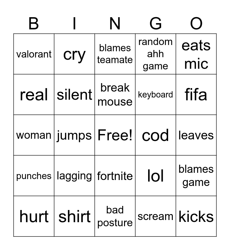 This bingo card has a free space and 24 words: lagging, shirt, break mouse, hurt, eats mic, valorant, real, cry, cod, fortnite, keyboard, woman, lol, blames game, silent, scream, leaves, blames teamate, fifa, jumps, kicks, punches, random ahh game and bad posture.