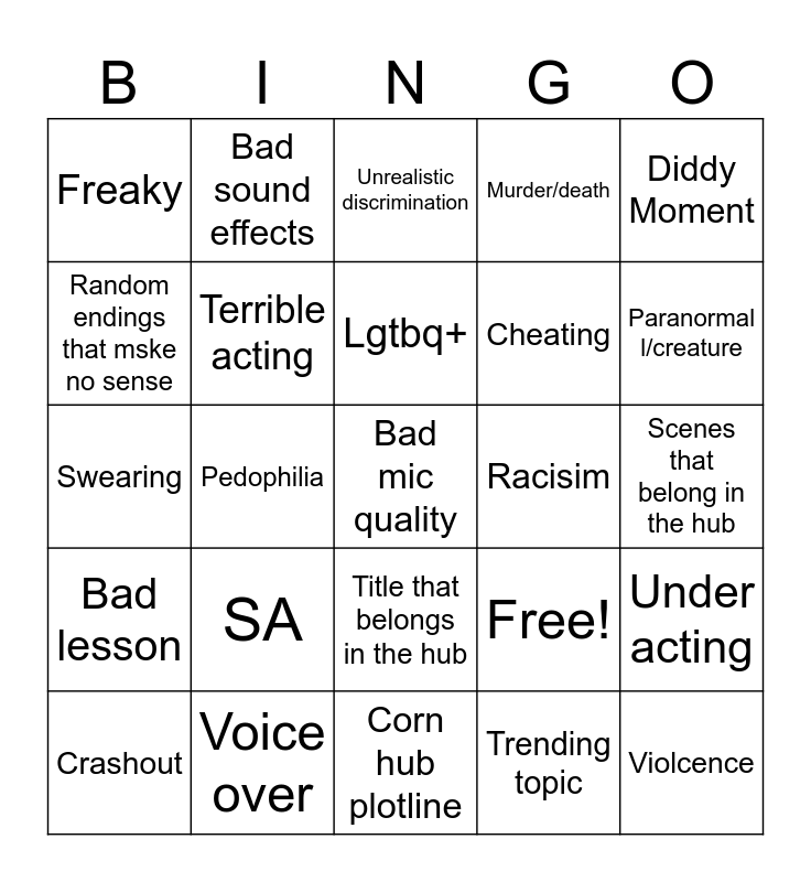 This bingo card has 25 words: SA, Corn hub plotline, Lgtbq+, Crashout, Diddy Moment, Freaky, Random endings that mske no sense, Bad sound effects, Racisim, Title that belongs in the hub, Cheating, Swearing, Free!, Under acting, Terrible acting, Violcence, Scenes that belong in the hub, Unrealistic discrimination, Paranormal l/creature, Pedophilia, Bad mic quality, Voice over, Bad lesson, Murder/death and Trending topic.