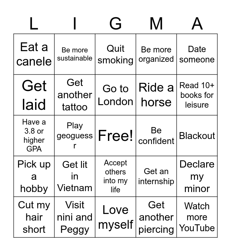 This bingo card has a free space and 24 words: Get lit in Vietnam, Visit nini and Peggy, Go to London, Cut my hair short, Date someone, Eat a canele, Get laid, Be more sustainable, Be confident, Accept others into my life, Ride a horse, Have a 3.8 or higher GPA, Get an internship, Declare my minor, Get another tattoo, Get another piercing, Blackout, Quit smoking, Read 10+ books for leisure, Play geoguess r, Watch more YouTube, Pick up a hobby, Be more organized and Love myself.