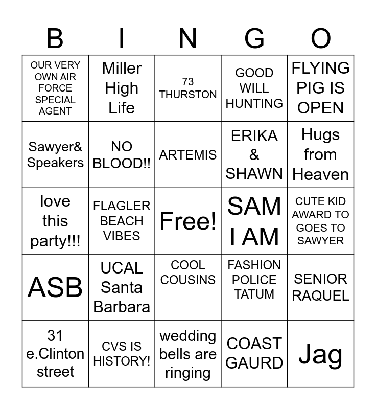 This bingo card has a free space and 49 words: Agnes Wagnes, Jag, going to the chapel, wedding bells are ringing, UCAL Santa Barbara, Harvard Yard, Miller High Life, 587 Shawmut, Sawyer& Speakers, NBHS DIVE TEAM #1, NO BLOOD!!, GOOD WILL HUNTING, SENIOR RAQUEL, FASHION POLICE TATUM, FAMILY ROCKS, THIS FAMILY IS THE BEST, ARTEMIS, SAM I AM, BEAR PAW, FLYING PIG IS OPEN, FLAGLER BEACH VIBES, COAST GAURD, OUR VERY OWN AIR FORCE SPECIAL AGENT, ERIKA & SHAWN, Granda Reis Jazz Genius!!!, Hugs from Heaven, 31 e.Clinton street, Mem's XMAS, COOL COUSINS, ASB, CHRISTMAS CALORIES DONT COUNT, g & t WITH SPLASH OF CRAN, VODKA SHOT, SHOTS SHOTS SHOTS TURN DOWN FOR WHAT, CVS IS HISTORY!, STUDY MARGAUX, FIANCE, NEWLYWEDS, CUTE KID AWARD TO GOES TO SAWYER, GREENLAND, nuuly, real family news !!!, puppies will be puppies, 2025 will be EPIC, love this party!!!, 73 THURSTON, TEQUILA AND SODA, GO WHALERS!!! and HAPPY NEW YEAR !!!!.
