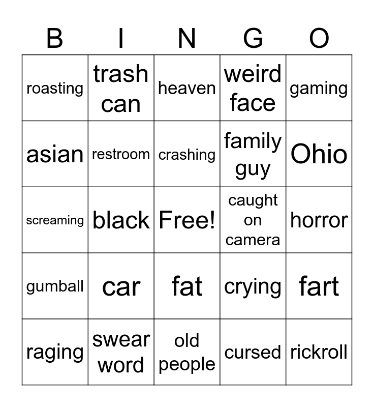 This bingo card has a free space and 24 words: car, swear word, crashing, raging, gaming, roasting, asian, trash can, caught on camera, fat, family guy, screaming, crying, fart, restroom, cursed, horror, heaven, Ohio, black, rickroll, gumball, weird face and old people.