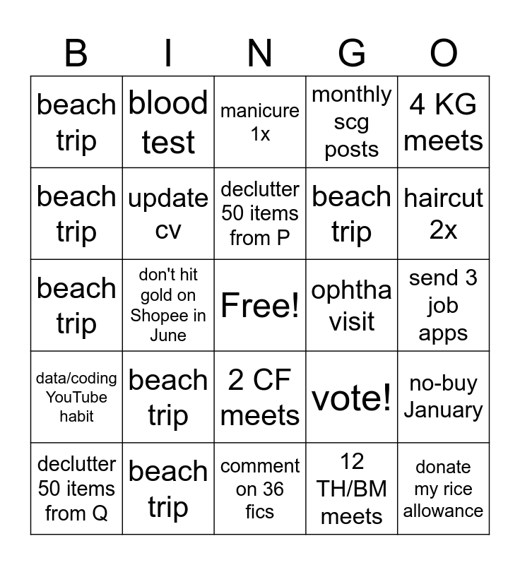 This bingo card has a free space and 24 words: beach trip, beach trip, declutter 50 items from P, declutter 50 items from Q, 4 KG meets, beach trip, beach trip, blood test, ophtha visit, 2 CF meets, beach trip, beach trip, vote!, no-buy January, update cv, 12 TH/BM meets, send 3 job apps, manicure 1x, haircut 2x, don't hit gold on Shopee in June, donate my rice allowance, data/coding YouTube habit, monthly scg posts and comment on 36 fics.