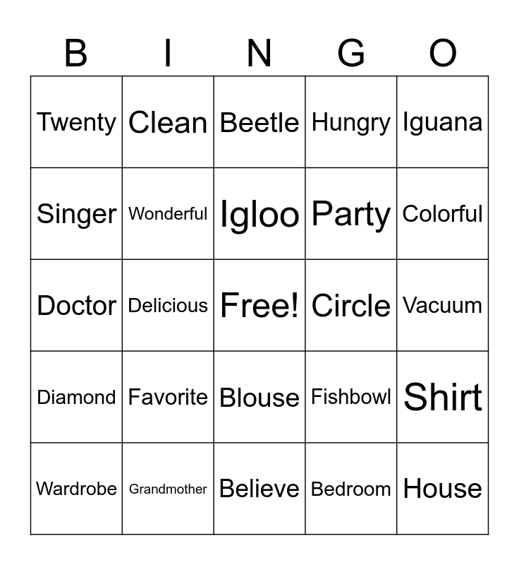 This bingo card has a free space and 24 words: Favorite, Grandmother, Igloo, Wardrobe, Iguana, Twenty, Singer, Clean, Circle, Blouse, Party, Doctor, Fishbowl, Shirt, Wonderful, Bedroom, Vacuum, Beetle, Colorful, Delicious, House, Diamond, Hungry and Believe.