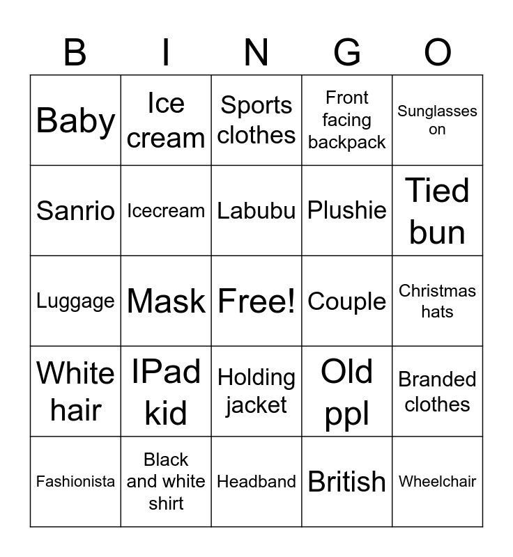 This bingo card has a free space and 24 words: IPad kid, Black and white shirt, Labubu, Fashionista, Sunglasses on, Baby, Sanrio, Ice cream, Couple, Holding jacket, Plushie, Luggage, Old ppl, Branded clothes, Icecream, British, Christmas hats, Sports clothes, Tied bun, Mask, Wheelchair, White hair, Front facing backpack and Headband.