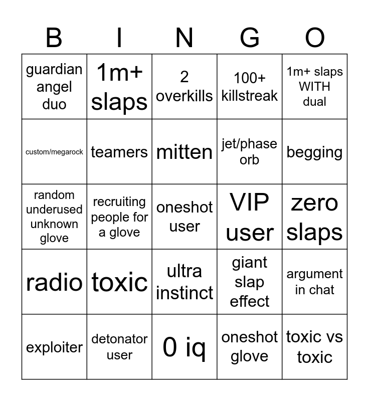 This bingo card has a free space and 24 words: toxic, detonator user, mitten, exploiter, 1m+ slaps WITH dual, guardian angel duo, custom/megarock, 1m+ slaps, VIP user, ultra instinct, jet/phase orb, random underused unknown glove, giant slap effect, argument in chat, teamers, oneshot glove, zero slaps, 2 overkills, begging, recruiting people for a glove, toxic vs toxic, radio, 100+ killstreak and 0 iq.