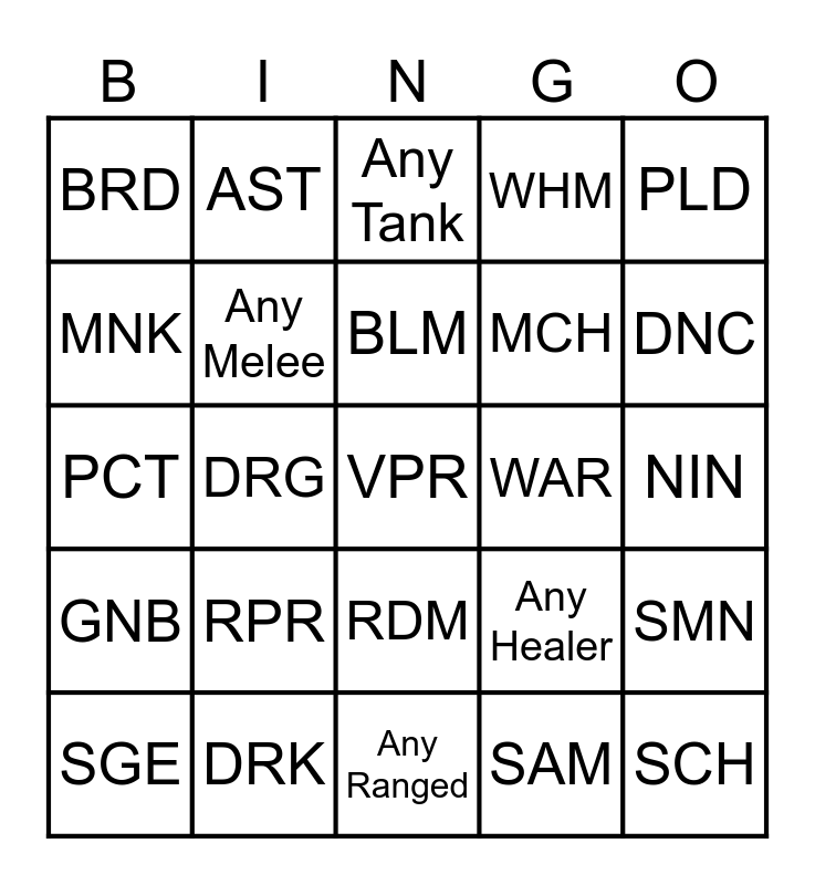 This bingo card has a free space and 24 words: SGE, RPR, BLM, SAM, PLD, BRD, AST, Any Tank, WAR, NIN, PCT, Any Melee, Any Healer, SMN, MNK, DRK, Any Ranged, WHM, DNC, GNB, DRG, RDM, MCH and SCH.
