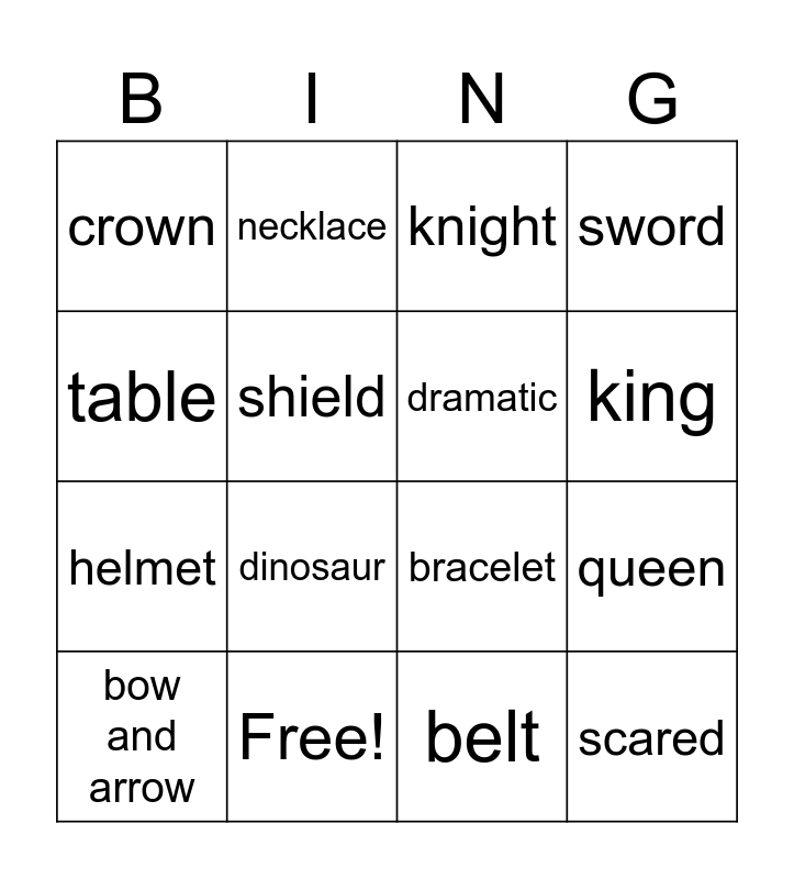 This bingo card has 16 words: Free!, queen, knight, crown, helmet, necklace, bracelet, belt, table, shield, bow and arrow, sword, dinosaur, king, dramatic and scared.