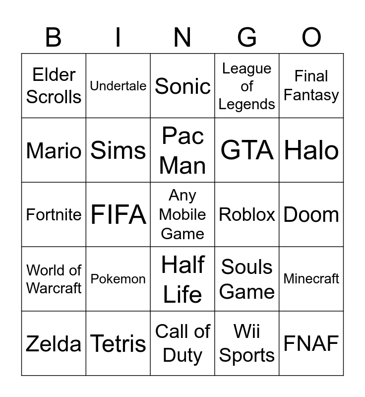 This bingo card has a free space and 24 words: Pokemon, Tetris, Pac Man, Zelda, Final Fantasy, Elder Scrolls, Mario, Undertale, Roblox, Half Life, GTA, Fortnite, Souls Game, Minecraft, Sims, Wii Sports, Doom, Sonic, Halo, FIFA, FNAF, World of Warcraft, League of Legends and Call of Duty.