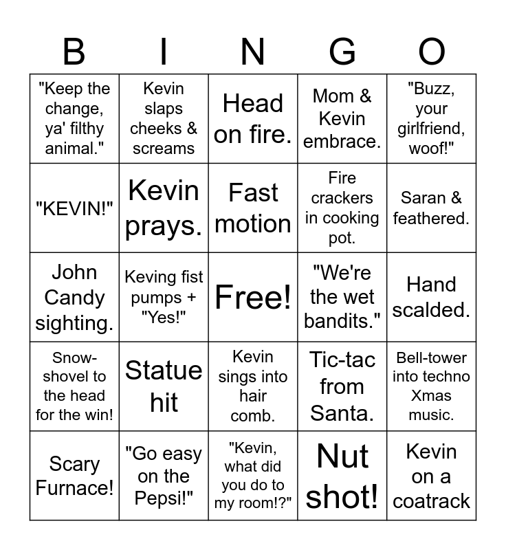 This bingo card has a free space and 24 words: Statue hit, "Go easy on the Pepsi!", Fast motion, Scary Furnace!, "Buzz, your girlfriend, woof!", "Keep the change, ya' filthy animal.", "KEVIN!", Kevin slaps cheeks & screams, "We're the wet bandits.", Kevin sings into hair comb., Fire crackers in cooking pot., John Candy sighting., Tic-tac from Santa., Bell-tower into techno Xmas music., Kevin prays., Nut shot!, Hand scalded., Head on fire., Saran & feathered., Keving fist pumps + "Yes!", Kevin on a coatrack, Snow-shovel to the head for the win!, Mom & Kevin embrace. and "Kevin, what did you do to my room!?".