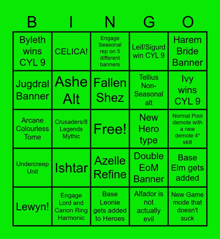 This bingo card has a free space and 24 words: Ishtar, Engage Lord and Canon Ring Harmonic, Fallen Shez, Lewyn!, Harem Bride Banner, Byleth wins CYL 9, Jugdral Banner, CELICA!, New Hero type, Azelle Refine, Tellius Non-Seasonal alt, Arcane Colourless Tome, Double EoM Banner, Base Elm gets added, Ashe Alt, Alfador is not actually evil, Normal Pool demote with a new demote 4* skill, Engage Seasonal rep on 5 different banners, Ivy wins CYL 9, Crusaders/8 Legends Mythic, New Game mode that doesn't suck, Undercreep Unit, Leif/Sigurd win CYL 9 and Base Leonie gets added to Heroes.