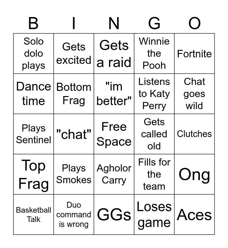 This bingo card has a free space and 34 words: Wins game, Loses game, Duos Rush, Plays Raze, Top Frag, Bottom Frag, Fortnite, Basketball Talk, Gets excited, Screams, "im better", Gets a raid, Listens to K-pop, Stream Snipped, Gets called old, Chat goes wild, Duo command is wrong, Plays Sentinel, Plays Smokes, Fills for the team, Agholor Carry, Duos someone, Solo dolo plays, Clutches, GGs, Aces, Winnie the Pooh, Karaoke, Listens to Katy Perry, Dance time, Plays another game, "chat", Ong and OMG.