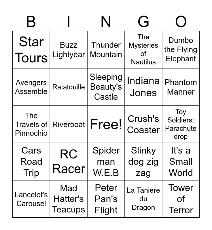 This bingo card has a free space and 28 words: It's a Small World, Adventure Isle, Indiana Jones, La Taniere du Dragon, Avengers Assemble, Thunder Mountain, Buzz Lightyear, Cars Road Trip, Crush's Coaster, Lancelot's Carousel, The Travels of Pinnochio, The Mysteries of Nautilus, Mad Hatter's Teacups, Peter Pan's Flight, Phantom Manner, Pirates of the Caribbean, RC Racer, Ratatouille, Sleeping Beauty's Castle, Spider man W.E.B, Star Tours, Star Wars: Hyperspace Mountain, Tower of Terror, Riverboat, Toy Soldiers: Parachute drop, Slinky dog zig zag, Dumbo the Flying Elephant and Flying carpets of Agrabah.