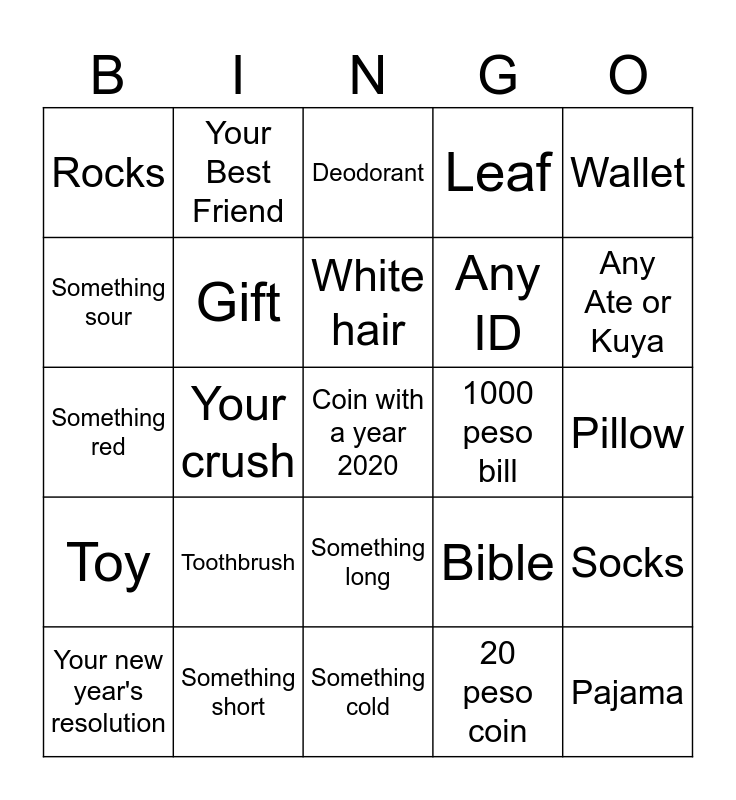 This bingo card has 25 words: Toothbrush, Something cold, White hair, Your new year's resolution, Wallet, Rocks, Something sour, Your Best Friend, 1000 peso bill, Something long, Any ID, Something red, Bible, Socks, Gift, Pajama, Pillow, Deodorant, Any Ate or Kuya, Your crush, Coin with a year 2020, Something short, Toy, Leaf and 20 peso coin.