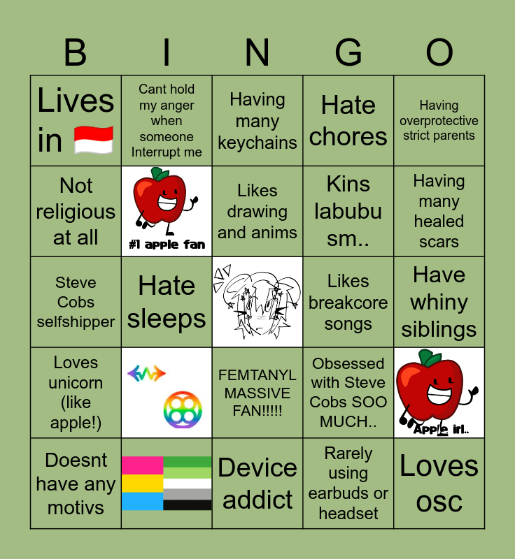 This bingo card has 4 images, a free space and 20 words: Likes drawing and anims, Doesnt have any motivs, Having overprotective strict parents, Lives in š®š©, Not religious at all, Cant hold my anger when someone Interrupt me, Likes breakcore songs, FEMTANYL MASSIVE FAN!!!!!, Kins labubu sm.., Steve Cobs selfshipper, Obsessed with Steve Cobs SOO MUCH.., Rarely using earbuds or headset, Have whiny siblings, Having many keychains, Having many healed scars, Hate sleeps, Loves osc, Loves unicorn (like apple!), Hate chores and Device addict.