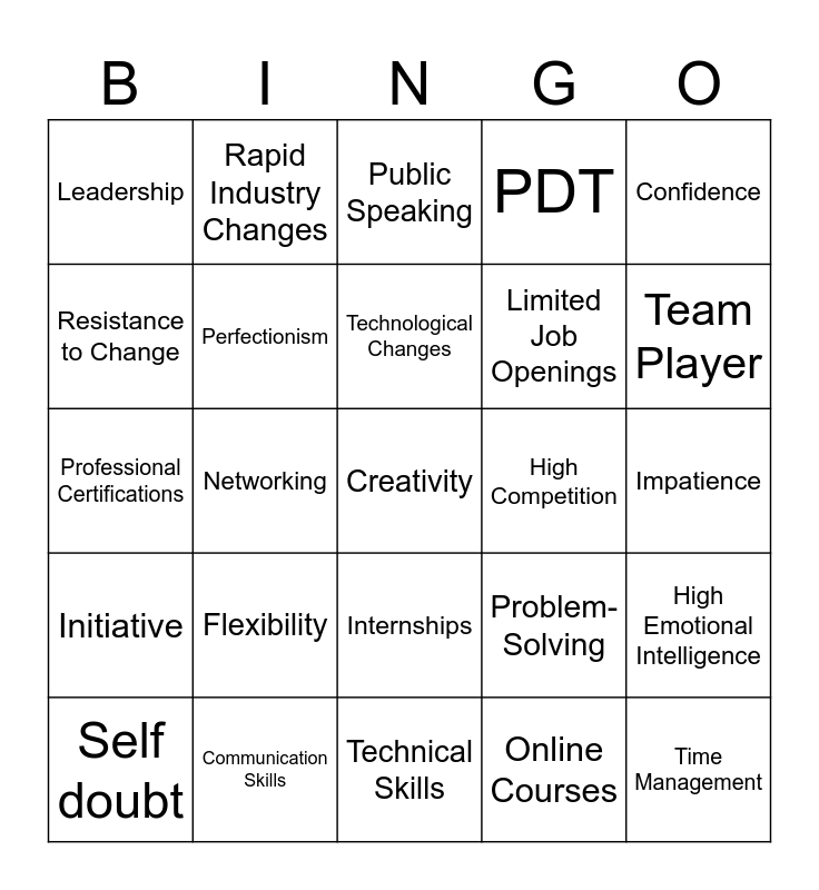 This bingo card has 30 words: Communication Skills, Procrastination, Networking, Lack of Experience, Leadership, Public Speaking, Perfectionism, Internships, High Competition, Technical Skills, Impatience, Creativity, Online Courses, Time Management, Team Player, Self-Doubt, Problem-Solving, Initiative, Flexibility, Confidence, Professional Certifications, Volunteering, Rapid Industry Changes, Limited Job Openings, Resistance to Change, PDT, High Emotional Intelligence, Self doubt, Technological Changes and KKEM.