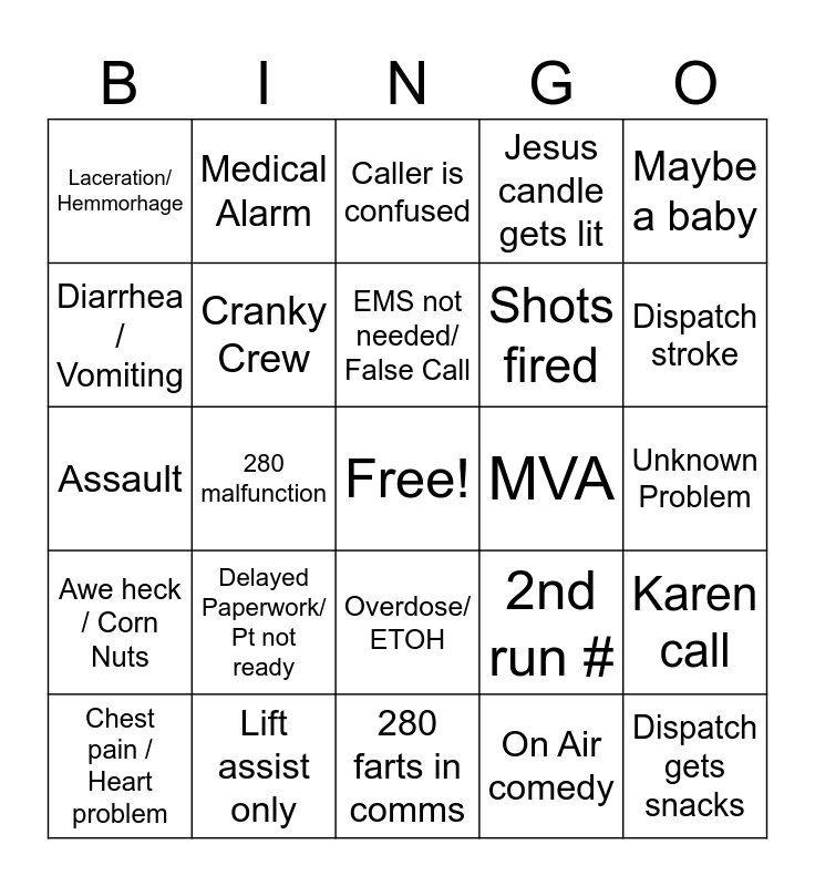 This bingo card has a free space and 24 words: Delayed Paperwork/ Pt not ready, Lift assist only, EMS not needed/ False Call, Chest pain / Heart problem, Maybe a baby, Laceration/ Hemmorhage, Diarrhea / Vomiting, Medical Alarm, MVA, Overdose/ ETOH, Shots fired, Assault, 2nd run #, Karen call, Cranky Crew, On Air comedy, Unknown Problem, Caller is confused, Dispatch stroke, 280 malfunction, Dispatch gets snacks, Awe heck / Corn Nuts, Jesus candle gets lit and 280 farts in comms.