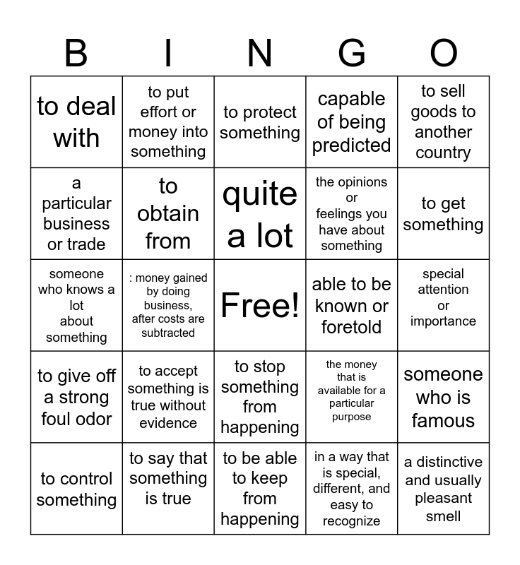 This bingo card has a free space and 24 words: to accept something is true without evidence, to say that something is true, quite a lot, to control something, to sell goods to another country, to deal with, a particular business or trade, to put effort or money into something, able to be known or foretold, to stop something from happening, the opinions or feelings you have about something, someone who knows a lot about something, the money that is available for a particular purpose, someone who is famous, to obtain from, in a way that is special, different, and easy to recognize, special attention or importance, to protect something, to get something, : money gained by doing business, after costs are subtracted, a distinctive and usually pleasant smell, to give off a strong foul odor, capable of being predicted and to be able to keep from happening.