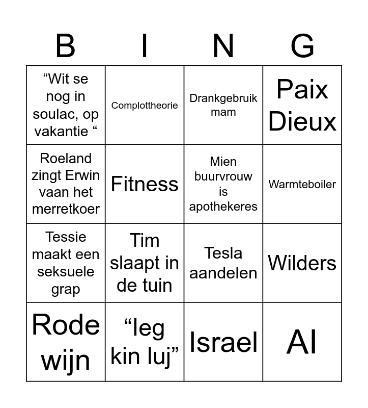 This bingo card has 16 words: “Ieg kin luj”, Wilders, Drankgebruik mam, “Wit se nog in soulac, op vakantie “, Tessie maakt een seksuele grap, Complottheorie, Tesla aandelen, Israel, Roeland zingt Erwin vaan het merretkoer, Fitness, Rode wijn, Paix Dieux, Tim slaapt in de tuin, Warmteboiler, Mien buurvrouw is apothekeres and AI.