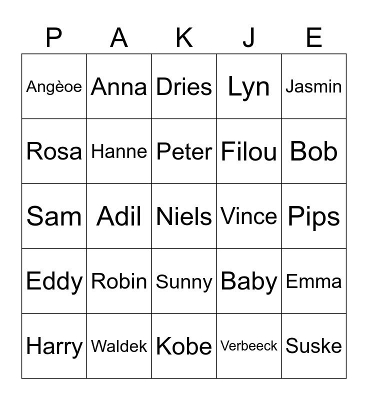 This bingo card has 37 words: Frank, Simonne, Tom, Hanne, Emma, Robin, Peter, Vic, Jasmin, Jaan, Adil, Lyn, Niels, Pips, Rosa, Eddy, Britney, Dries, Sunny, Vince, Angèoe, Bob, Harry, Kobe, Bomans, Verbeeck, Anna, Dieter, Nancy, Leo, Polly, Waldek, Sam, Suske, Baby, Filou and Lowie.