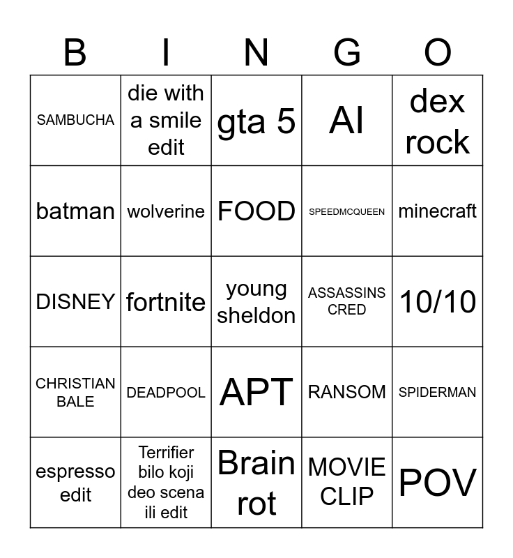 This bingo card has a free space and 24 words: DEADPOOL, Terrifier bilo koji deo scena ili edit, FOOD, espresso edit, dex rock, SAMBUCHA, batman, die with a smile edit, ASSASSINS CRED, APT, SPEEDMCQUEEN, DISNEY, RANSOM, SPIDERMAN, wolverine, MOVIE CLIP, 10/10, gta 5, minecraft, fortnite, POV, CHRISTIAN BALE, AI and Brain rot.
