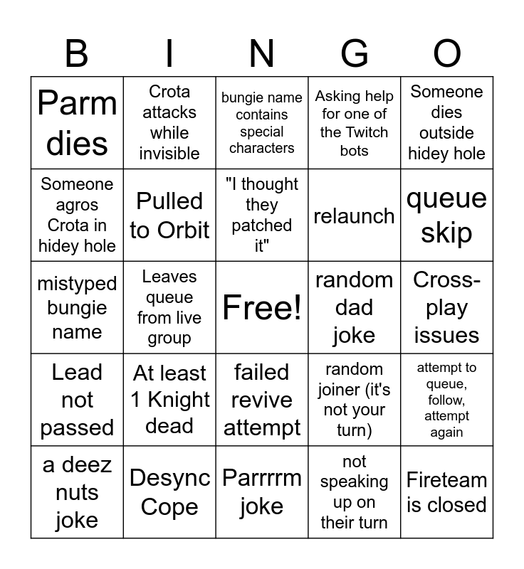 This bingo card has a free space and 24 words: At least 1 Knight dead, Desync Cope, "I thought they patched it", a deez nuts joke, Someone dies outside hidey hole, Parm dies, Someone agros Crota in hidey hole, Crota attacks while invisible, random dad joke, failed revive attempt, relaunch, mistyped bungie name, random joiner (it's not your turn), attempt to queue, follow, attempt again, Pulled to Orbit, not speaking up on their turn, Cross-play issues, bungie name contains special characters, queue skip, Leaves queue from live group, Fireteam is closed, Lead not passed, Asking help for one of the Twitch bots and Parrrrm joke.