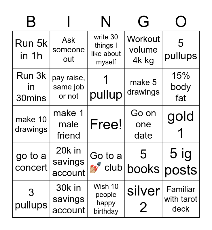 This bingo card has a free space and 24 words: 20k in savings account, 30k in savings account, 1 pullup, 3 pullups, 5 pullups, Run 5k in 1h, Run 3k in 30mins, Ask someone out, Go on one date, Go to a 💅🏼 club, make 5 drawings, make 10 drawings, 5 books, 5 ig posts, pay raise, same job or not, silver 2, gold 1, write 30 things I like about myself, 15% body fat, make 1 male friend, Familiar with tarot deck, go to a concert, Workout volume 4k kg and Wish 10 people happy birthday.
