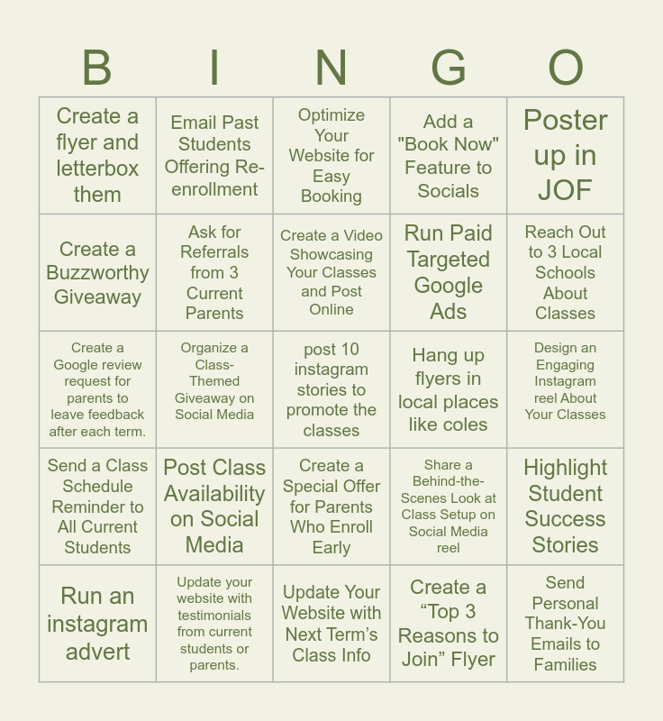 This bingo card has a free space and 24 words: Post Class Availability on Social Media, Update your website with testimonials from current students or parents., Create a Video Showcasing Your Classes and Post Online, Run an instagram advert, Poster up in JOF, Create a flyer and letterbox them, Create a Buzzworthy Giveaway, Email Past Students Offering Re-enrollment, Hang up flyers in local places like coles, Create a Special Offer for Parents Who Enroll Early, Run Paid Targeted Google Ads, Create a Google review request for parents to leave feedback after each term., Share a Behind-the-Scenes Look at Class Setup on Social Media reel, Highlight Student Success Stories, Ask for Referrals from 3 Current Parents, Create a “Top 3 Reasons to Join” Flyer, Design an Engaging Instagram reel About Your Classes, Optimize Your Website for Easy Booking, Reach Out to 3 Local Schools About Classes, Organize a Class-Themed Giveaway on Social Media, Send Personal Thank-You Emails to Families, Send a Class Schedule Reminder to All Current Students, Add a "Book Now" Feature to Socials and Update Your Website with Next Term’s Class Info.