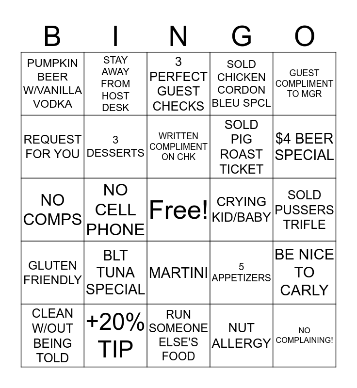 This bingo card has a free space and 25 words: BLT TUNA SPECIAL, RUN SOMEONE ELSE'S FOOD, WRITTEN COMPLIMENT ON CHK, CLEAN W/OUT BEING TOLD, GUEST COMPLIMENT TO MGR, PUMPKIN BEER W/VANILLA VODKA, REQUEST FOR YOU, STAY AWAY FROM HOST DESK, CRYING KID/BABY, MARTINI, SOLD PIG ROAST TICKET, NO COMPS, 5 APPETIZERS, BE NICE TO CARLY, 3 DESSERTS, SEPARATE CHECKS FOR WHOLE TABLE, SOLD PUSSERS TRIFLE, 3 PERFECT GUEST CHECKS, $4 BEER SPECIAL, NO CELL PHONE, NO COMPLAINING!, +20% TIP, GLUTEN FRIENDLY, SOLD CHICKEN CORDON BLEU SPCL and NUT ALLERGY.