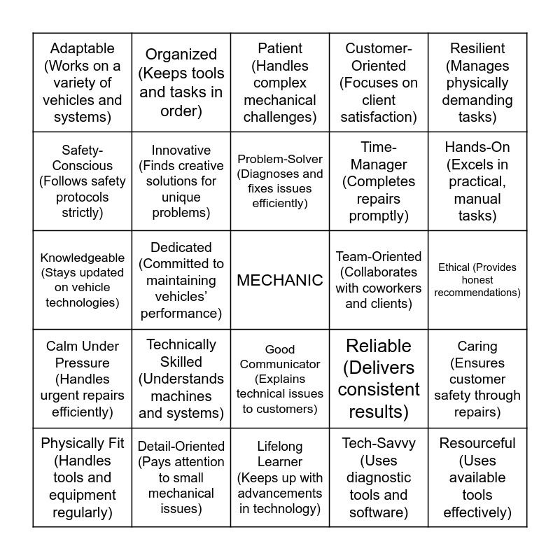 This bingo card has a free space and 24 words: Technically Skilled (Understands machines and systems), Detail-Oriented (Pays attention to small mechanical issues), Problem-Solver (Diagnoses and fixes issues efficiently), Physically Fit (Handles tools and equipment regularly), Resilient (Manages physically demanding tasks), Adaptable (Works on a variety of vehicles and systems), Safety-Conscious (Follows safety protocols strictly), Organized (Keeps tools and tasks in order), Team-Oriented (Collaborates with coworkers and clients), Good Communicator (Explains technical issues to customers), Time-Manager (Completes repairs promptly), Knowledgeable (Stays updated on vehicle technologies), Reliable (Delivers consistent results), Caring (Ensures customer safety through repairs), Innovative (Finds creative solutions for unique problems), Tech-Savvy (Uses diagnostic tools and software), Ethical (Provides honest recommendations), Patient (Handles complex mechanical challenges), Hands-On (Excels in practical, manual tasks), Dedicated (Committed to maintaining vehicles’ performance), Resourceful (Uses available tools effectively), Calm Under Pressure (Handles urgent repairs efficiently), Customer-Oriented (Focuses on client satisfaction) and Lifelong Learner (Keeps up with advancements in technology).