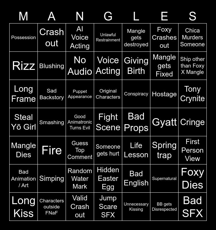 This bingo card has 49 words: Supernatural, Mangle gets Fixed, Unnecessary Kissing, Smashing, Puppet Appearance, Cringe, Crash out, Valid Crash out, Foxy Crashes out, Someone gets hurt, Chica Murders Someone, Unlawful Restrainment, Hostage, Conspiracy, Simping, Gyatt, Rizz, Ship other than Foxy X Mangle, Foxy Dies, Mangle gets destroyed, Giving Birth, Good Animatronic Turns Evil, Possession, Blushing, Long Kiss, No Audio, Tony Crynite, Characters outside FNaF, Original Characters, Sad Backstory, Bad SFX, Bad Props, Bad Animation / Art, Random Water Mark, Steal Yō Girl, Life Lesson, Spring trap, First Person View, Long Frame, Guess Top Comment, Hidden Easter Egg, Mangle Dies, Fight Scene, Jump Scare SFX, Voice Acting, AI Voice Acting, Bad English, Fire and BB gets Disrespected.
