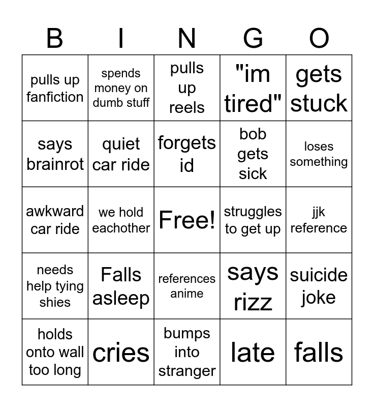 This bingo card has a free space and 24 words: Falls asleep, cries, forgets id, holds onto wall too long, gets stuck, pulls up fanfiction, says brainrot, spends money on dumb stuff, struggles to get up, references anime, bob gets sick, awkward car ride, says rizz, suicide joke, quiet car ride, late, jjk reference, pulls up reels, loses something, we hold eachother, falls, needs help tying shies, "im tired" and bumps into stranger.
