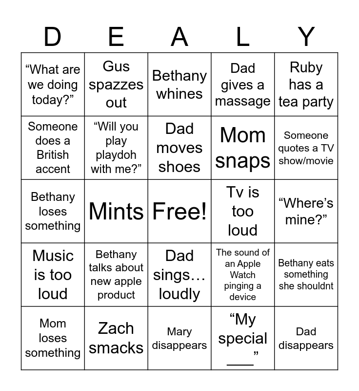 This bingo card has a free space and 24 words: Bethany talks about new apple product, Zach smacks, Dad moves shoes, Mom loses something, Ruby has a tea party, “What are we doing today?”, Someone does a British accent, Gus spazzes out, Tv is too loud, Dad sings… loudly, Mom snaps, Bethany loses something, The sound of an Apple Watch pinging a device, Bethany eats something she shouldnt, “Will you play playdoh with me?”, “My special ___”, “Where’s mine?”, Bethany whines, Someone quotes a TV show/movie, Mints, Dad disappears, Music is too loud, Dad gives a massage and Mary disappears.