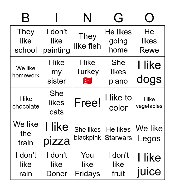 This bingo card has a free space and 24 words: I like pizza, I don't like Doner, I like Turkey 🇹🇷, I don't like rain, He likes Rewe, They like school, We like homework, I don't like painting, I like to color, She likes blackpink, She likes piano, I like chocolate, He likes Starwars, We like Legos, I like my sister, I don't like fruit, I like vegetables, They like fish, I like dogs, She likes cats, I like juice, We like the train, He likes going home and You like Fridays.