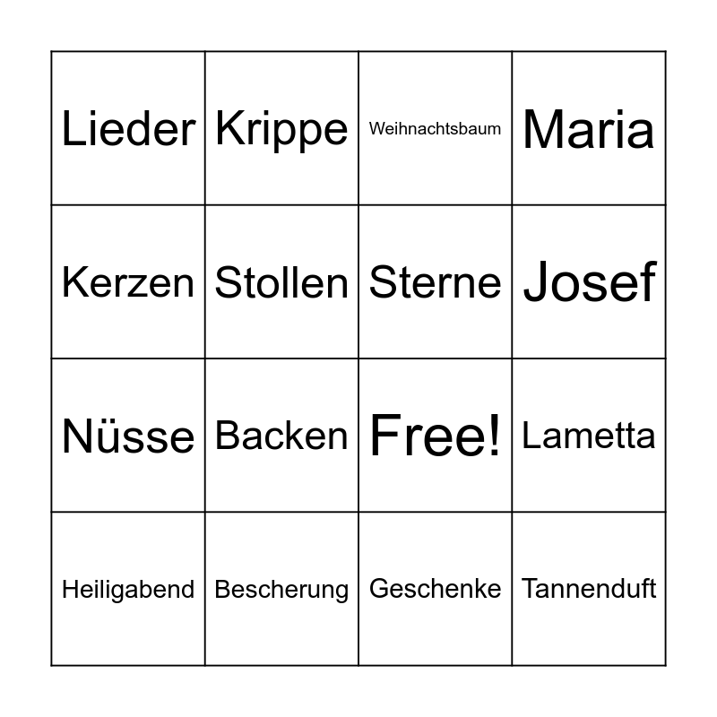 This bingo card has 19 words: Free!, Vorfreude, Weihnachtsbaum, Tannenduft, Lametta, Kerzen, Geschenke, Lieder, Krippe, Nüsse, Backen, Stollen, Sterne, Bescherung, Heiligabend, Engel, Maria, Josef and Jesus.