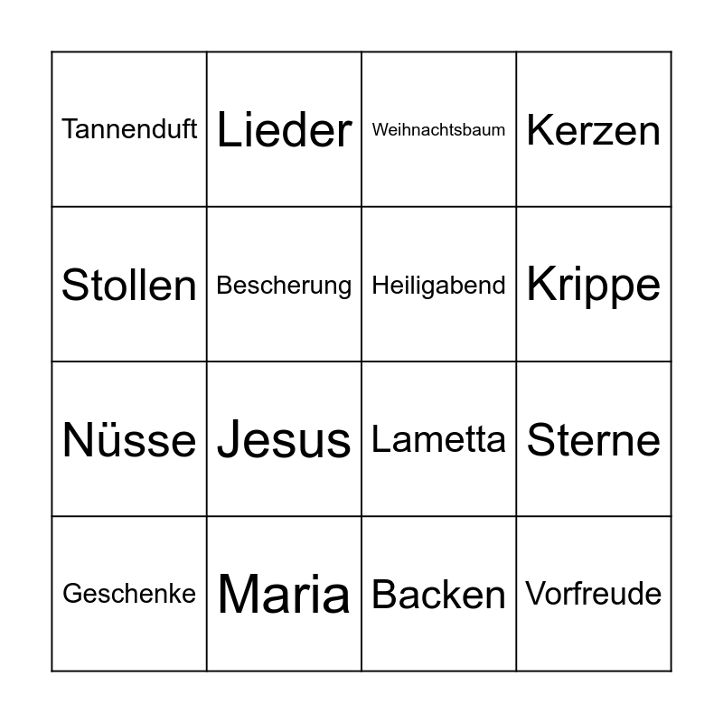 This bingo card has 18 words: Jesus, Vorfreude, Weihnachtsbaum, Tannenduft, Lametta, Kerzen, Geschenke, Lieder, Krippe, Nüsse, Backen, Stollen, Sterne, Bescherung, Heiligabend, Engel, Maria and Josef.