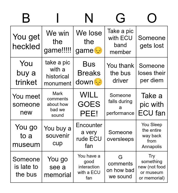 This bingo card has a free space and 25 words: You buy a souvenir cup, You have a good interaction with a ECU fan, Bus Breaks down😔, Someone is late to the bus, Someone gets lost, You get heckled, You buy a trinket, We win the game!!!!!, Someone falls during a performance, Encounter a very rude ECU fan, You thank the bus driver, You meet someone new, Someone oversleeps, You Sleep the entire way back from Annapolis, take a pic with a historical monument, You try a new food, Take a pic with ECU fan, We lose the game😔, Someone loses their per diem, Mark comments about how bad we sound, Try something new (not food or museum or memorial), You go see a memorial, You go to a museum, Take a pic with ECU band member and G comments on how bad we sound.