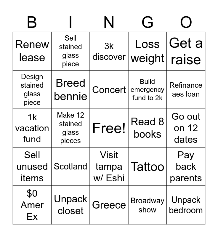 This bingo card has a free space and 25 words: Scotland, Greece, Concert, $0 Amer Ex, Get a raise, Renew lease, Design stained glass piece, Sell stained glass piece, Read 8 books, Visit tampa w/ Eshi, Build emergency fund to 2k, 1k vacation fund, Tattoo, Pay back parents, Breed bennie, Try cosplay, Go out on 12 dates, 3k discover, Refinance aes loan, Make 12 stained glass pieces, Unpack bedroom, Unpack closet, Sell unused items, Loss weight and Broadway show.