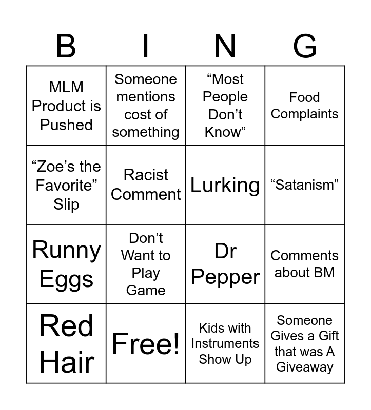 This bingo card has 21 words: Free!, Someone mentions their wedding weight, Someone mentions cost of something, Someone makes a negative comment re: appearance, Kids with Instruments Show Up, Lurking, MLM Product is Pushed, “Most People Don’t Know”, Dr Pepper, “Satanism”, Runny Eggs, Food Complaints, Someone Gives a Gift that was A Giveaway, “The” ____ (group of people), Racist Comment, PJs Don’t Fit, Red Hair, Don’t Want to Play Game, “Zoe’s the Favorite” Slip, Comments about BM and No One Claims the H20 Bottle.