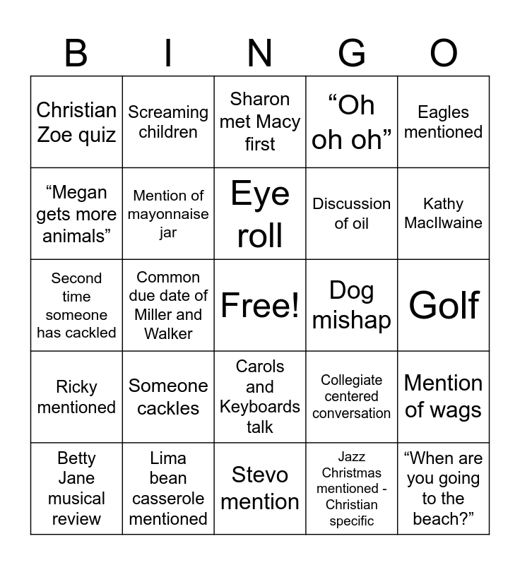This bingo card has a free space and 24 words: Someone cackles, Lima bean casserole mentioned, Eye roll, Betty Jane musical review, Eagles mentioned, Christian Zoe quiz, “Megan gets more animals”, Screaming children, Dog mishap, Carols and Keyboards talk, Discussion of oil, Second time someone has cackled, Collegiate centered conversation, Mention of wags, Mention of mayonnaise jar, Jazz Christmas mentioned - Christian specific, Golf, Sharon met Macy first, Kathy MacIlwaine, Common due date of Miller and Walker, “When are you going to the beach?”, Ricky mentioned, “Oh oh oh” and Stevo mention.
