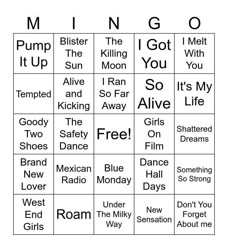 This bingo card has a free space and 35 words: Just Can't Get Enough, Lips Like Sugar, In A Big Country, Alive and Kicking, Blue Monday, I Got You, Tempted, Keep Feeling Fascination, I Ran So Far Away, One Way or Another, Goody Two Shoes, I Melt With You, Obsession, Weird Science, Pump It Up, Girls On Film, New Sensation, The Safety Dance, Brand New Lover, Don't You Forget About me, Dance Hall Days, West End Girls, Something So Strong, Roam, The Killing Moon, It's My Life, She's a Beauty, Personal Jesus, So Alive, Shattered Dreams, Cars, Under The Milky Way, Mexican Radio, Blister The Sun and Puttin' On The Ritz.