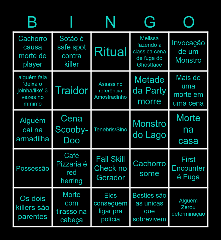 This bingo card has 25 words: Café Pizzaria é red herring, Eles conseguem ligar pra polícia, Assassino referência Amostradinho, Os dois killers são parentes, Invocação de um Monstro, Cachorro causa morte de player, alguém fala 'deixa o joinha/like' 3 vezes no mínimo, Sotão é safe spot contra killer, Monstro do Lago, Fail Skill Check no Gerador, Metade da Party morre, Alguém cai na armadilha, Cachorro some, First Encounter é Fuga, Traidor, Alguém Zerou determinação, Morte na casa, Ritual, Mais de uma morte em uma cena, Cena Scooby-Doo, Tenebris/Sino, Morte com tirasso na cabeça, Possessão, Melissa fazendo a classica cena de fuga do Ghostface and Besties são as únicas que sobrevivem.