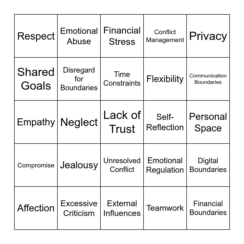 This bingo card has 50 words: Trust, Excessive Criticism, Past Trauma, Forgiveness, Personal Space, Communication, Emotional Abuse, Poor Communication Skills, Flexibility, Emotional Boundaries, Respect, Disregard for Boundaries, Lack of Trust, Teamwork, Time Limits, Support, Neglect, Time Constraints, Gratitude, Privacy, Empathy, Manipulation, Financial Stress, Self-Reflection, No Tolerance for Abuse, Compromise, Jealousy, Fear of Vulnerability, Conflict Management, Digital Boundaries, Independence, Disrespect, Mental Health Issues, Active Listening, Family Boundaries, Affection, Dishonesty, External Influences, Assertiveness, Communication Boundaries, Conflict Resolution, Lack of Communication, Unresolved Conflict, Problem-Solving, Financial Boundaries, Shared Goals, Controlling Behavior, Different Values, Emotional Regulation and Social Boundaries.