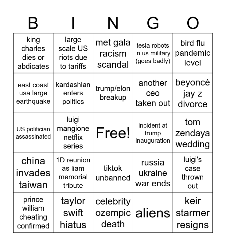 This bingo card has a free space and 24 words: 1D reunion as liam memorial tribute, taylor swift hiatus, trump/elon breakup, prince william cheating confirmed, bird flu pandemic level, king charles dies or abdicates, east coast usa large earthquake, large scale US riots due to tariffs, incident at trump inauguration, tiktok unbanned, another ceo taken out, US politician assassinated, russia ukraine war ends, luigi's case thrown out, kardashian enters politics, aliens, tom zendaya wedding, met gala racism scandal, beyoncé jay z divorce, luigi mangione netflix series, keir starmer resigns, china invades taiwan, tesla robots in us military (goes badly) and celebrity ozempic death.
