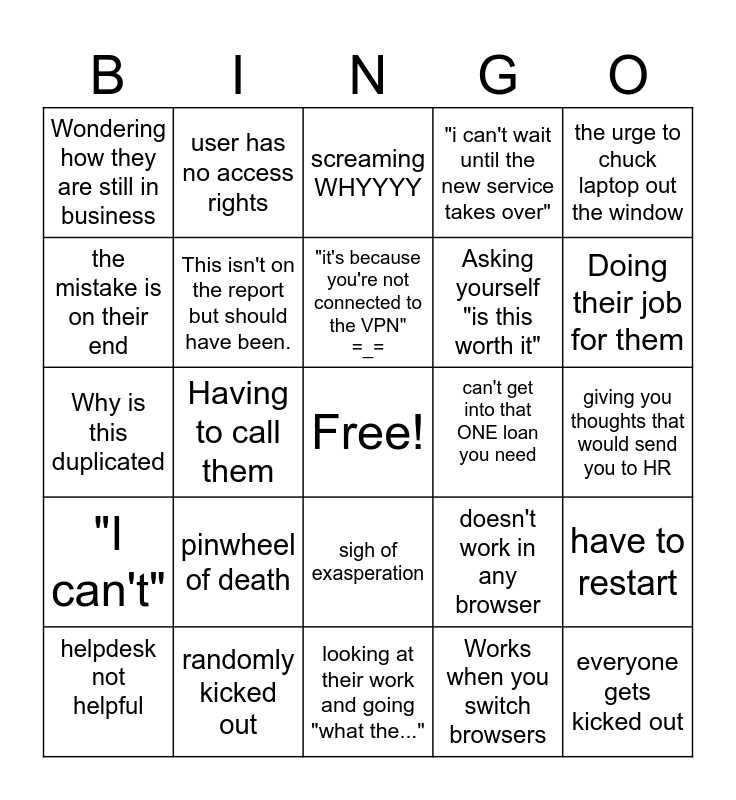 This bingo card has a free space and 24 words: pinwheel of death, randomly kicked out, "it's because you're not connected to the VPN" =_=, helpdesk not helpful, the urge to chuck laptop out the window, Wondering how they are still in business, the mistake is on their end, user has no access rights, can't get into that ONE loan you need, sigh of exasperation, Asking yourself "is this worth it", Why is this duplicated, doesn't work in any browser, have to restart, This isn't on the report but should have been., Works when you switch browsers, giving you thoughts that would send you to HR, screaming WHYYYY, Doing their job for them, Having to call them, everyone gets kicked out, "I can't", "i can't wait until the new service takes over" and looking at their work and going "what the...".
