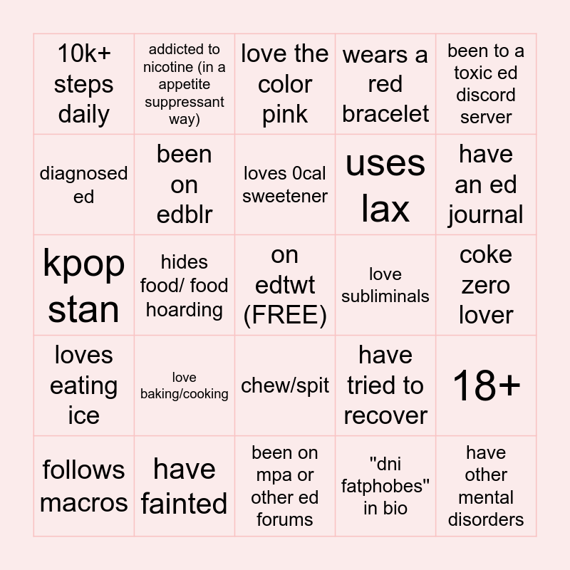 This bingo card has a free space and 24 words: love baking/cooking, have fainted, loves 0cal sweetener, follows macros, been to a toxic ed discord server, 10k+ steps daily, diagnosed ed, addicted to nicotine (in a appetite suppressant way), love subliminals, chew/spit, uses lax, kpop stan, have tried to recover, 18+, been on edblr, ''dni fatphobes'' in bio, coke zero lover, love the color pink, have an ed journal, hides food/ food hoarding, have other mental disorders, loves eating ice, wears a red bracelet and been on mpa or other ed forums.