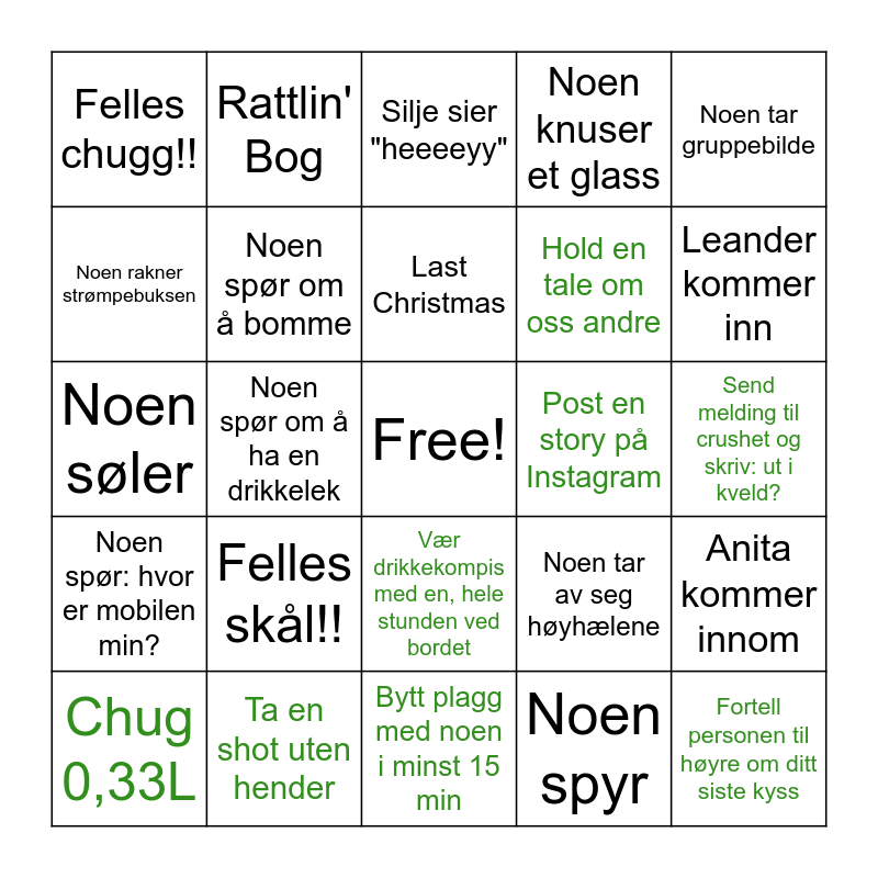 This bingo card has a free space and 24 words: Felles skål!!, Ta en shot uten hender, Last Christmas, Chug 0,33L, Noen tar gruppebilde, Felles chugg!!, Noen rakner strømpebuksen, Rattlin' Bog, Post en story på Instagram, Vær drikkekompis med en, hele stunden ved bordet, Hold en tale om oss andre, Noen søler, Noen tar av seg høyhælene, Anita kommer innom, Noen spør om å bomme, Noen spyr, Send melding til crushet og skriv: ut i kveld?, Silje sier "heeeeyy", Leander kommer inn, Noen spør om å ha en drikkelek, Fortell personen til høyre om ditt siste kyss, Noen spør: hvor er mobilen min?, Noen knuser et glass and Bytt plagg med noen i minst 15 min.