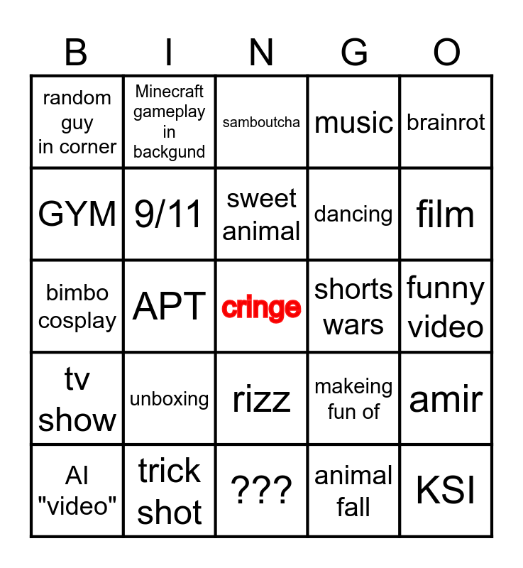 This bingo card has a free space and 24 words: AI "video", unboxing, sweet animal, animal fall, brainrot, random guy in corner, Minecraft gameplay in backgund, samboutcha, shorts wars, funny video, bimbo cosplay, 9/11, makeing fun of, amir, GYM, trick shot, ???, music, film, tv show, APT, rizz, dancing and KSI.